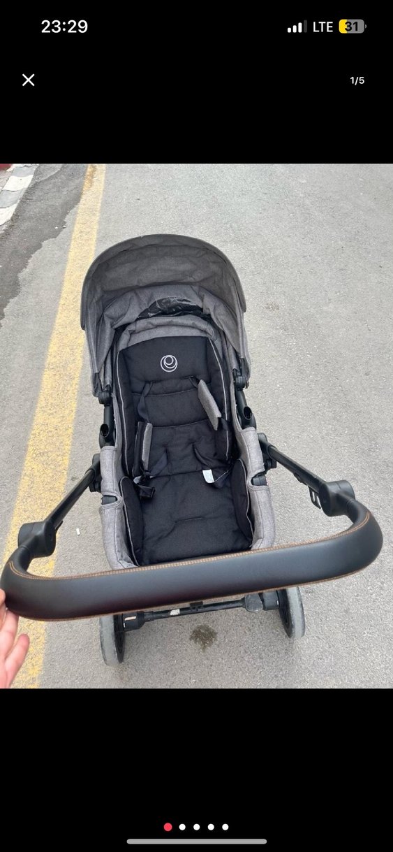 Gri bebek arabası, konfor için yastıklı oturma alanı ve ayarlanabilir tente içerir. Sağlam tutma kolu ve güvenli emniyet kemeri mevcuttur. Puseti mevcuttur. Bir iki kez kullanıldı hiçbir sıkıntısı yoktur sıfırdan farksız