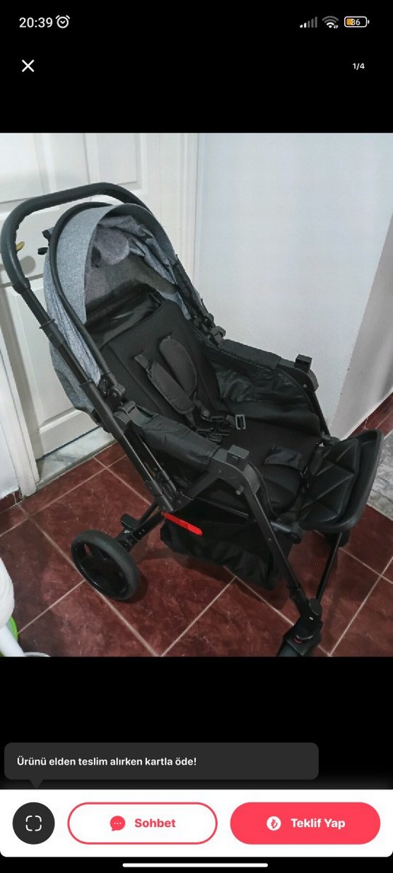 Joell marka Gri bebek arabası, sağlam iskelet ve emniyet kemerli rahat oturma alanı ile kolay kullanım sağlar.4-5 defa kullandık temiz,önündeki tente mevcuttur, kutusu ile gönderilir.