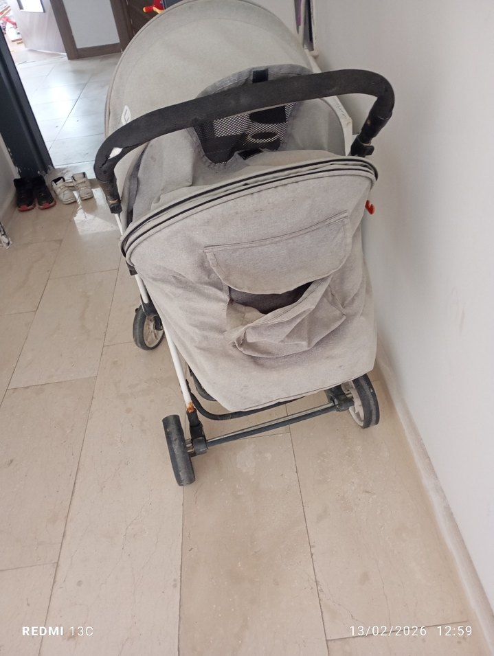 Gri bebek arabası, koruyucu tente ve saklama cebine sahiptir. Dört tekerlekli ve kolay kullanımlıdır.