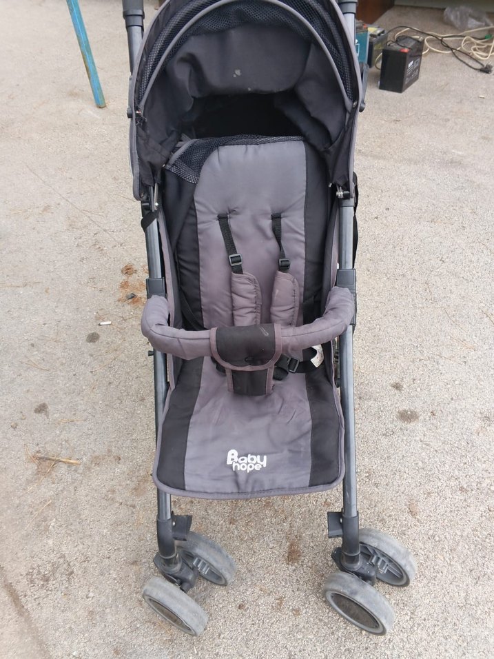 Gri renkli, yumuşak dolgulu oturma alanına ve emniyet kemerine sahip bebek arabası. Koruyucu tente ve ön güvenlik barı bulunur. sadece ankara
