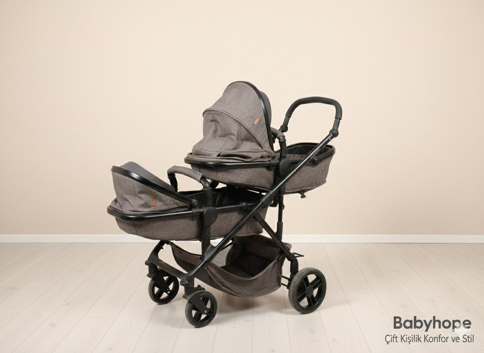 Gri renkli bebek arabası, çiftli oturma alanı ve sağlam yapıya sahiptir. Büyük tekerlekleri ve ayarlanabilir tutamaçları vardır. Depolama sepeti mevcuttur.PAZARLIK YAPILIR