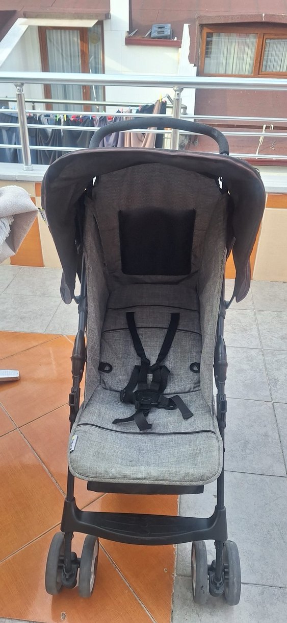 Gri renkli bebek arabası, ayarlanabilir emniyet kemeri ve yatabilen oturma yeri ile hafif tasarıma sahiptir. Güneşlikli ve kolay katlanabilir.