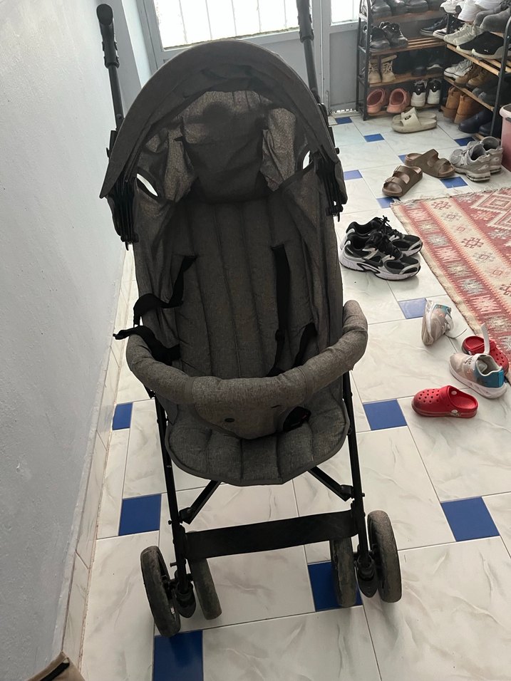 Gri bebek arabası, hafif yapısı ve konforluyastıklı oturma alanı ile dikkat çekiyor. Dört tekerlekli ve güvenlik barı bulunur. Baston tipi bebek arabası