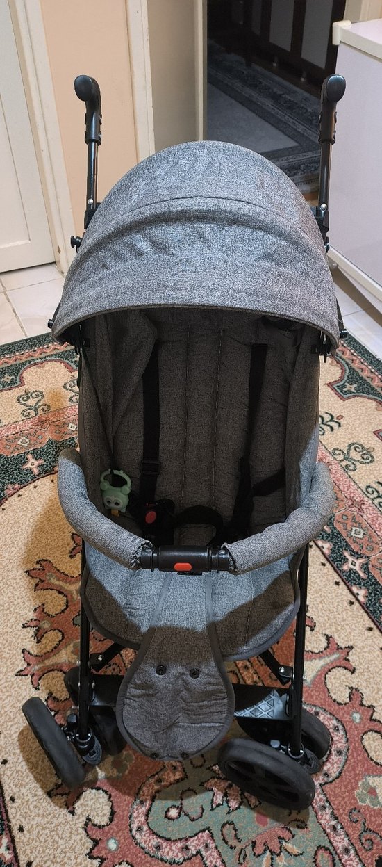 Koyu gri bebek arabası, hafif ve katlanabilir yapıya sahiptir. Farklı zeminlerde rahat kullanım için pürüzsüz tekerlekleri vardır hiç bir sorunu yok sıfır araba 1 ay kullandık araba sıfır taşınmadan dolayı satıyorum