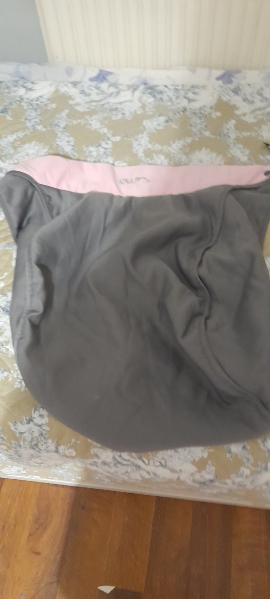 Gri ve pembe kenarlı, yumuşak kumaştan yapılmış bebek arabasi korumasi