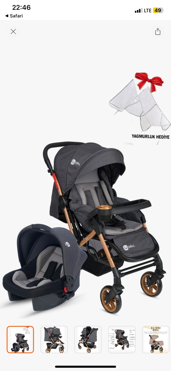 Gri renkli bebek arabası seti, oto koltuğu ve yanında yağmurluk hediyesi ile birlikte gelir. Konforlu oturma alanı ve sağlam tekerlekler bulunur. ☂️