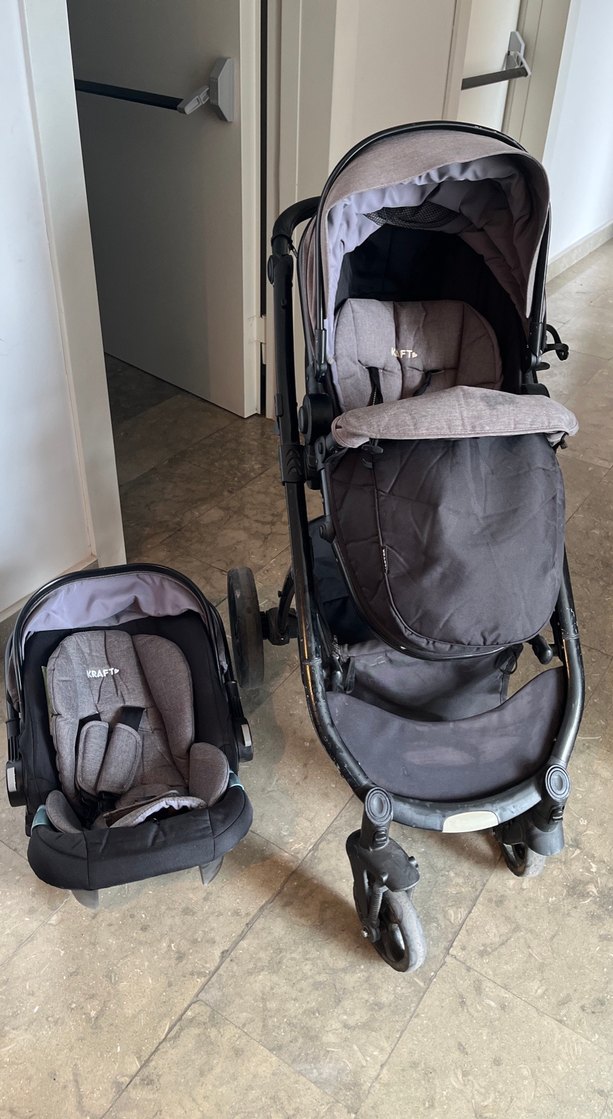 Gri renkli, yumuşak oturma alanı ve ayarlanabilir tenteye sahip bebek arabası ve oto koltuğu seti. Konforlu ve kullanımı kolaydır.