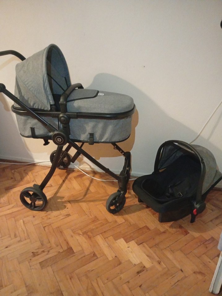 Çıkarılabilir beşikli gri bebek arabası ve ayrı bebek taşıma koltuğu. Dayanıklı iskelet ve kolay hareket eden tekerleklerle donatılmış. Ürünün alt sepeti yırtıldığı için tamamen çıkardım onun dışında bır sorunu yoktur.