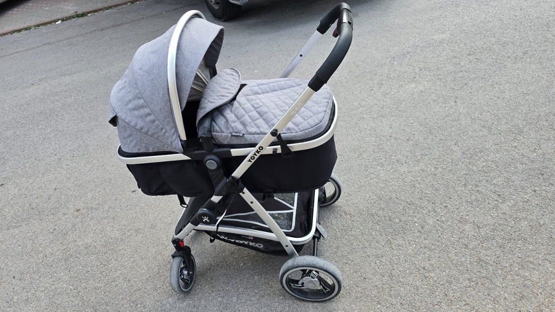 Yoyko marka gri kapitone kumaşlı, tente ve ayarlanabilir saplı bebek arabası. Dayanıklı tekerlekleriyle rahat kullanım sağlar. Puset dahil