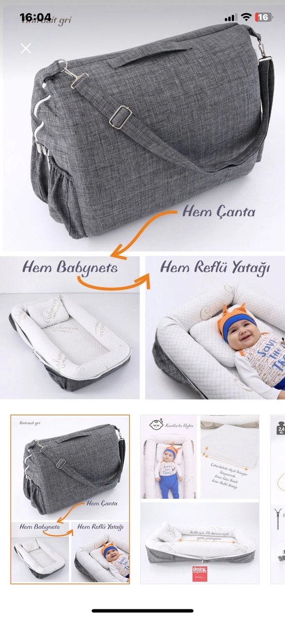 Gri renkli, yumuşak baskılı kumaştan yapılmış bebek babynest ve uyumlu omuz çantası seti. Bebekler için rahat alan ve taşıma kolaylığı sağlar.