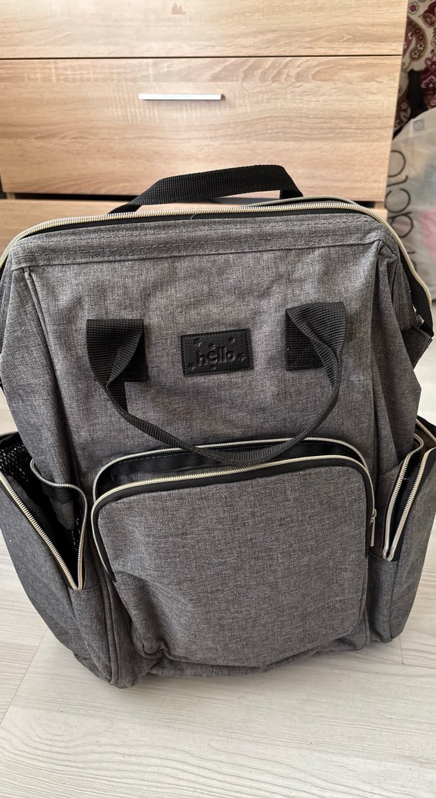 Gri renginde, çok bölmeli ve sağlam kulplu bebek bakım çantasıdır.