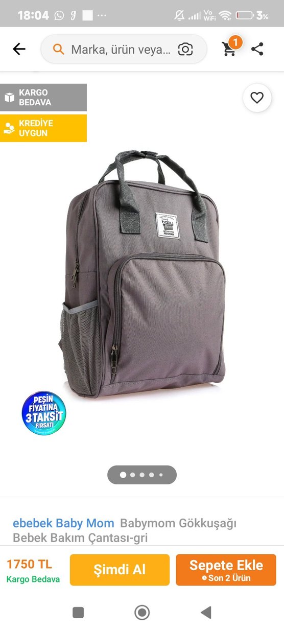 Gri renkte, geniş ana bölmeli ve çoklu cepleri olan bebek bakım çantası. Dayanıklı saplara sahiptir ve kredi ile taksit seçeneği uygundur.