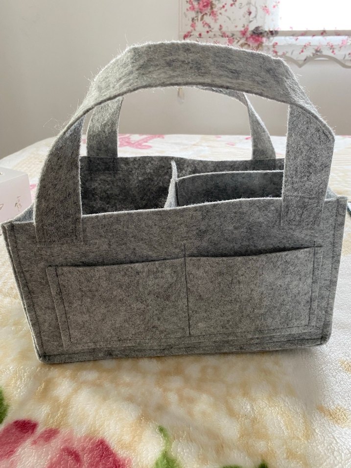 Yumuşak keçe kumaştan yapılmış, çok bölmeli ve sağlam saplı gri bebek bakım çantası. Bebek eşyalarını düzenlemek için uygundur.