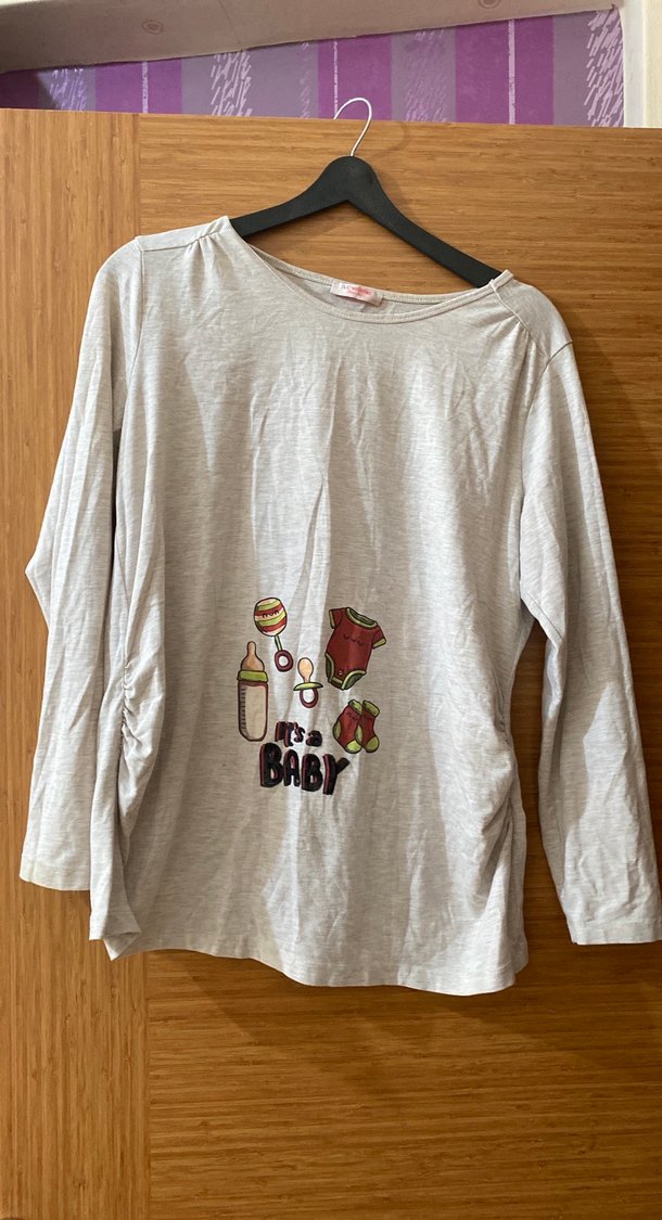 Pamuklu, gri renkli, uzun kollu, yuvarlak yakalı, bol kesim hamile bluzu. Bebek temalı baskı ve düğme detaylarına sahiptir, günlük kullanıma uygundur.