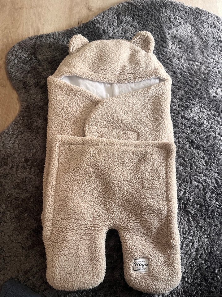 Yumuşak ve sıcak gri renkli, kulaklı kapüşonlu bebek battaniyesi. Desensiz tasarımıyla çocuklara rahatlık sağlar. Kızım 4 aylık olana kadar kış başından beri kullandık sımsıcak tutuyor, çok şirin ve çok pratik küçük geldiği için satıyorum