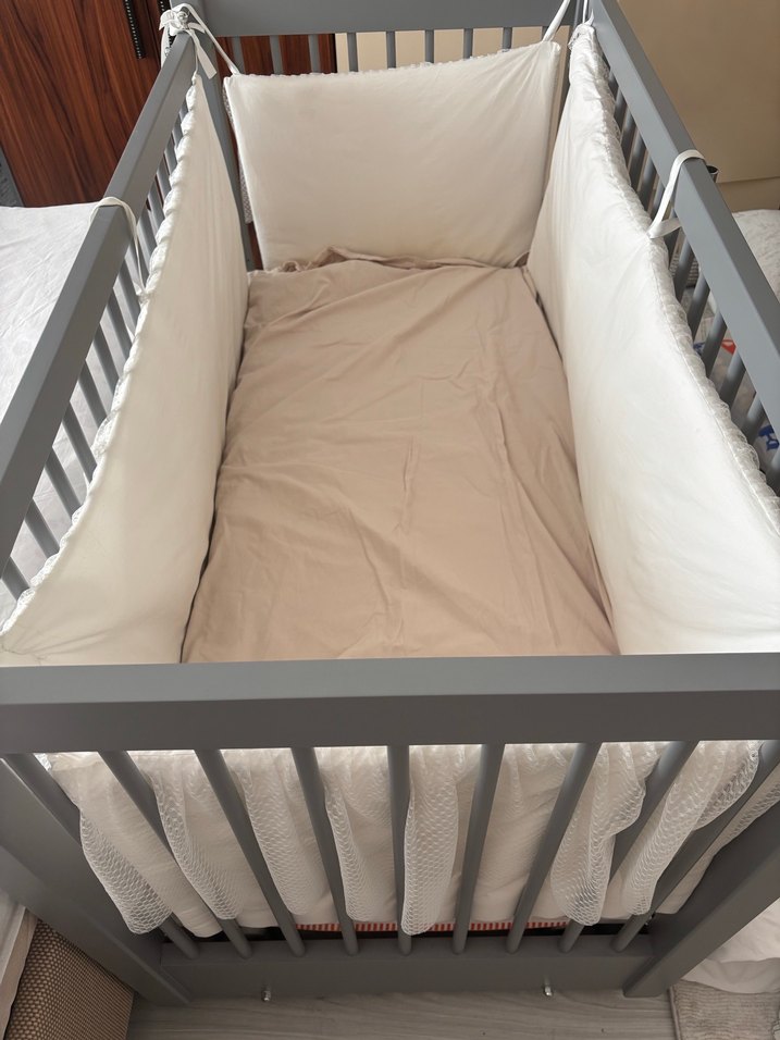 Yumuşak dolgulu yan korumaları olan gri bebek beşiği ve bej yatak seti, konfor ve güvenlik sağlar. ️