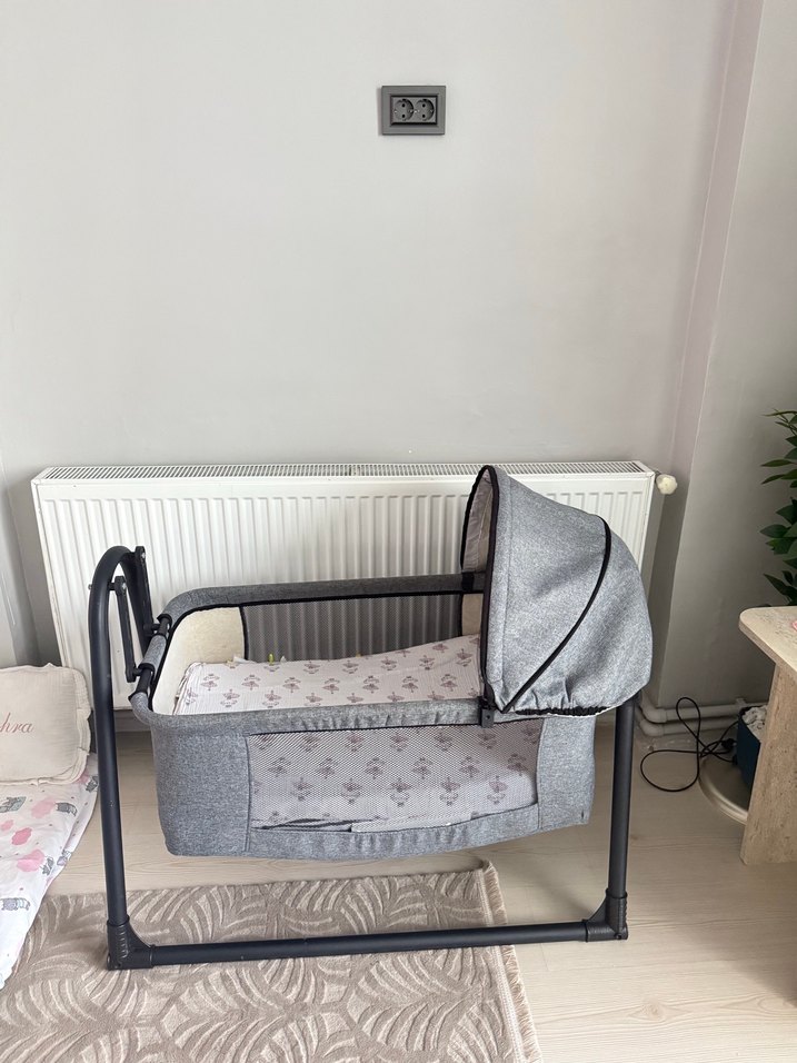Gri renkte, tente kapaklı bebek beşiği ve sepeti, yumuşak yatak ve sağlam çerçeve ile rahat ve güvenli kullanım sağlar. ️