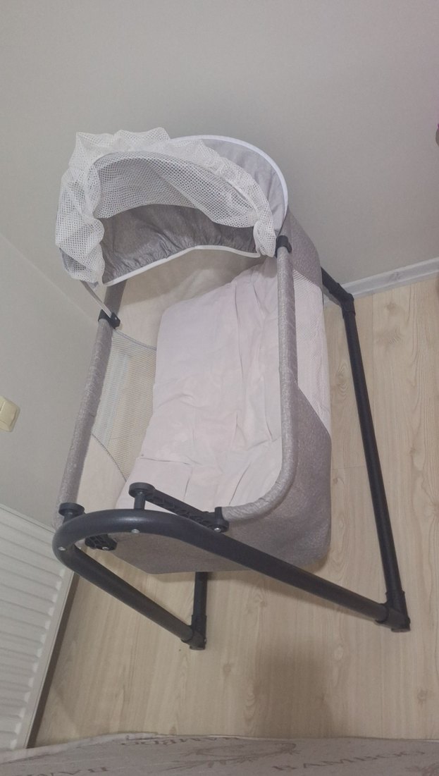 Gri renkli bebek beşiği, sağlam iskelet ve nefes alabilen tül tente ile birlikte gelir. Yumuşak kumaşlı rahat bir yatak alanı sunar. ️