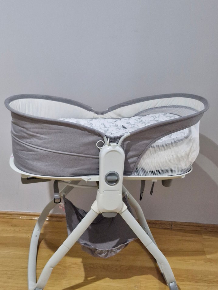 Yumuşak iç yüzeyli ve sağlam çerçeveli gri bebek beşiği ve sepeti, bebek konforu ve güvenliği için tasarlanmıştır. ️