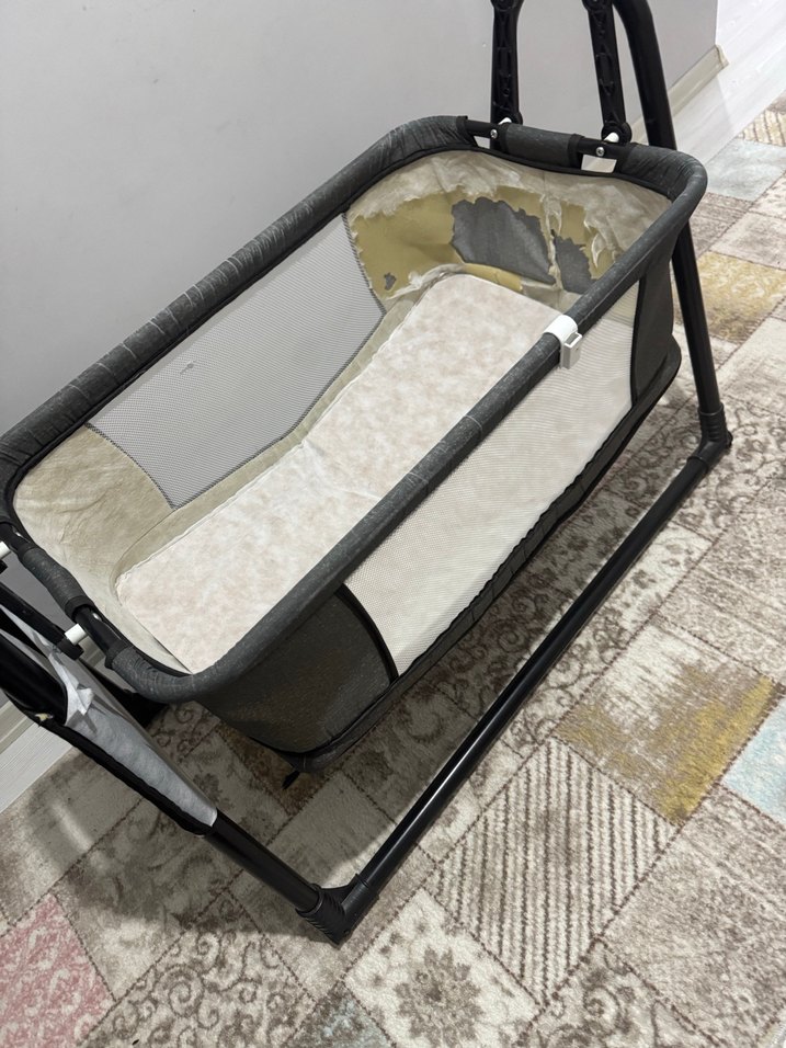 havalandırma için file yanlara sahip gri bebek beşiği ve sepeti. görünen yerde sadece süngerinde bir yırtık var sallanmasında falan sorun yok