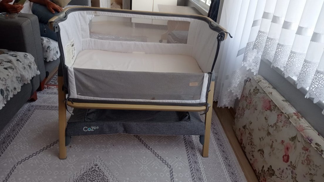 Gri renkli bebek beşiği ve sepeti, yumuşak yatak ve nefes alabilen file yanlarla rahatlık sağlar. Altında saklama sepeti bulunur. ️