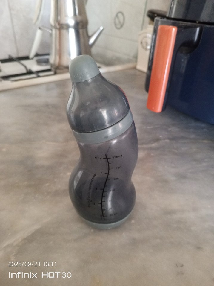 Ölçü işaretli, yumuşak emzikli ve rahat tutuş sağlayan kıvrımlı tasarımlı gri bebek biberonu. difnax marka meme ucu yok