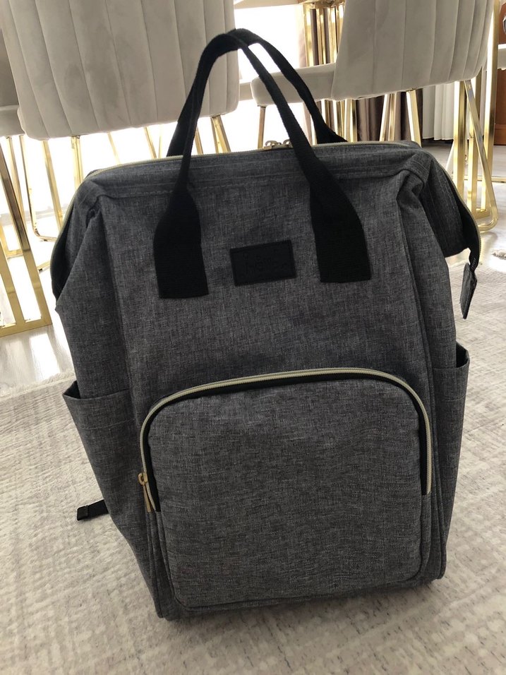 Gri renkli bebek çantası, çoklu cepler ve rahat taşıma sapları ile geniş depolama alanı sunar.