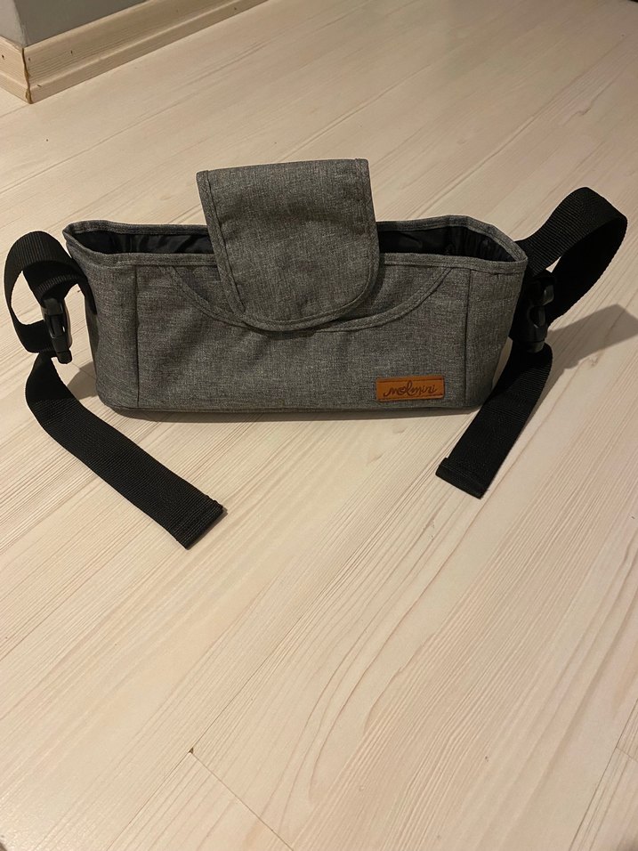 Ayarlanabilir siyah askıları ve kapaklı kapanışı olan gri bebek çantası, taşıma ve saklama için uygundur.