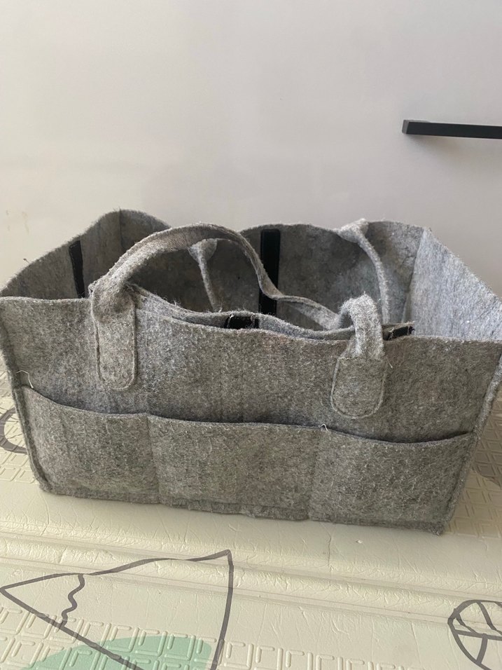 Yumuşak keçe görünümlü malzemeden yapılmış, çoklu dış cepleri ve taşıması kolay sağlam kulpları olan gri bebek çantası organizeri.