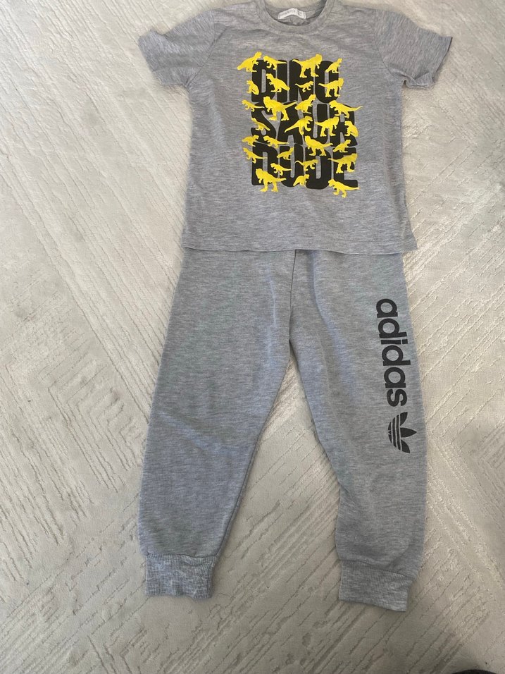 Kısa kollu, bisiklet yaka üstü baskılı desenli gri bebek erkek eşofman takımı. Yumuşak ve sıcak kumaştan fermuarlı pantolon içerir. Adidas logosu pantolonda yer alır.
