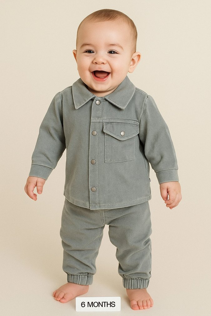 Gri denim kumaştan, uzun kollu ve yaka detaylı bebek erkek takımı. Düğmeli ön kapanış ve elastik paçalar rahatlık sağlar.