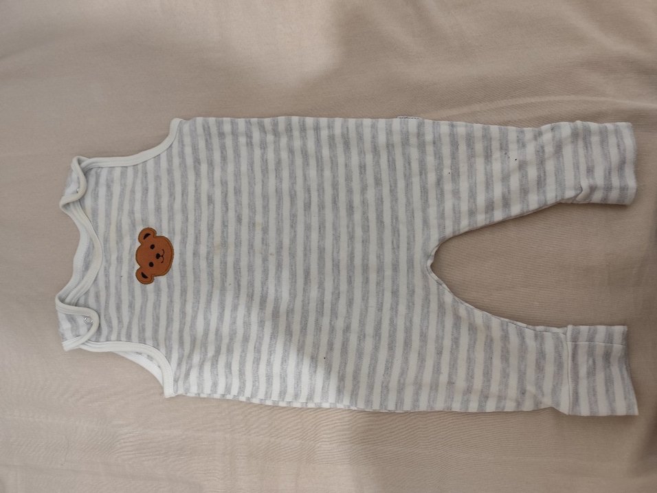 Gri renkli, kolsuz bebek tulumu, yuvarlak yakalı ve düğmeli. Yumuşak ve sıcak kumaştan, çizgili sade desenli, küçük ayı detaylı.
