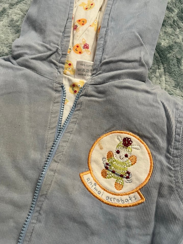 Gri renkli, yumuşak ve sıcak tutan polar kumaştan yapılmış, nakış detaylı ve fermuarlı bebek erkek mont. Sokak stili için uygun.