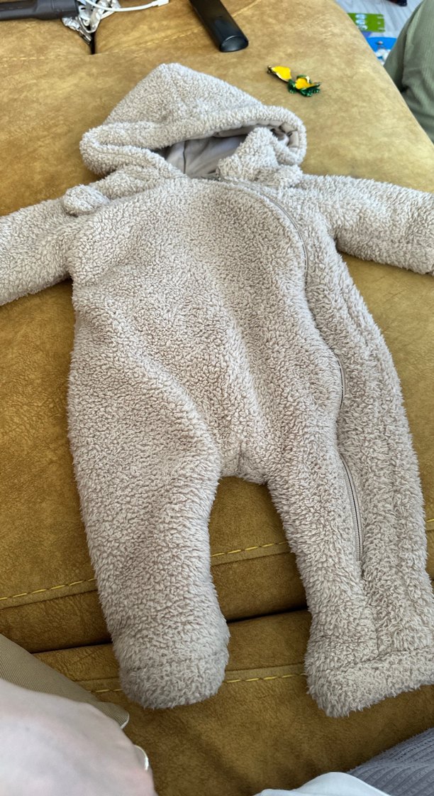 Gri renkli, yumuşak ve sıcak kumaştan yapılmış, kürk detaylı bebek erkek tulumu. Kapüşonlu ve kolay giyilmesi için yan fermuarlıdır.