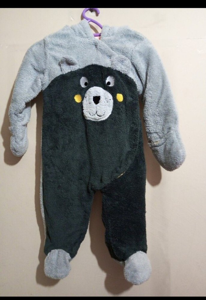 Yumuşak ve sıcak peluş kumaştan yapılmış gri renkli bebek tulumu, sevimli ayı yüzü detayına sahiptir. Rahat ve şık bir kıyafet. Sıfır ayarında 6-9 aylık bebek için.