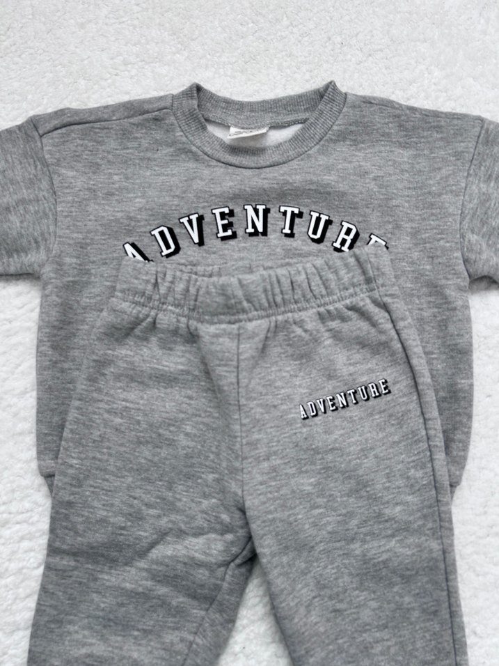 9-12 ay Hiç kullanılmadı sadece yıkandı İçi şardonlu Gri renkli, uzun kollu üst ve pantolondan oluşan bebek erkek takım. Yumuşak ve sıcak kumaştan, üzerlerinde "ADVENTURE" baskısı bulunur, rahat ve şık bir görünüm sunar.
