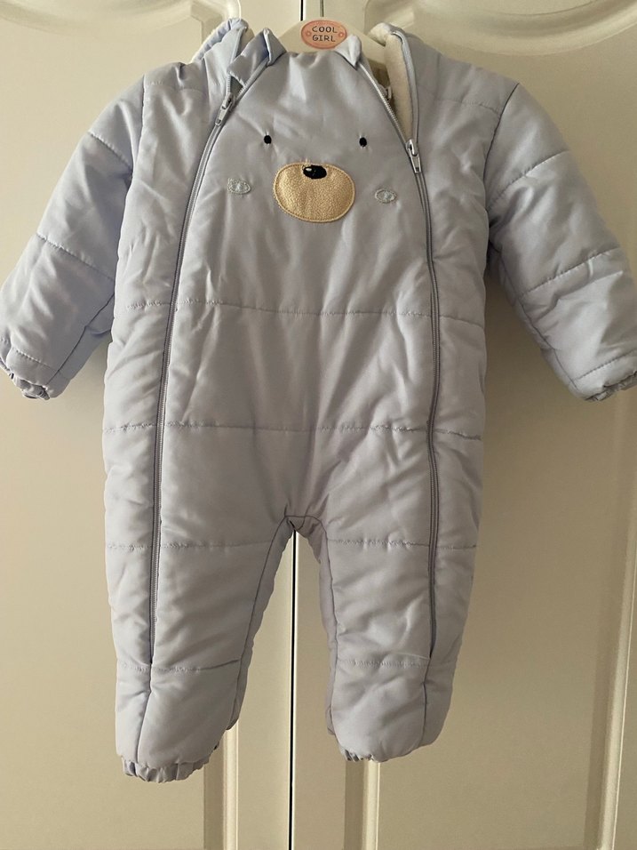 Gri renkte, kürklü detaylara sahip, yumuşak ve sıcak kumaştan yapılmış bebek erkek tulumu. Desensiz ve normcore tarzında, soğuk havalar için uygun. ❄️