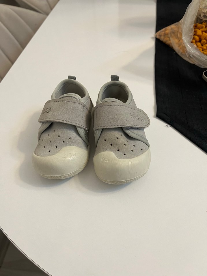 Gri renkli, cırt cırtlı ve kauçuk tabanlı ilk adım ayakkabısı sorunsuzdur ufak lekeleri var yıkandığında geçecek türden yırtık sökük vs yoktur