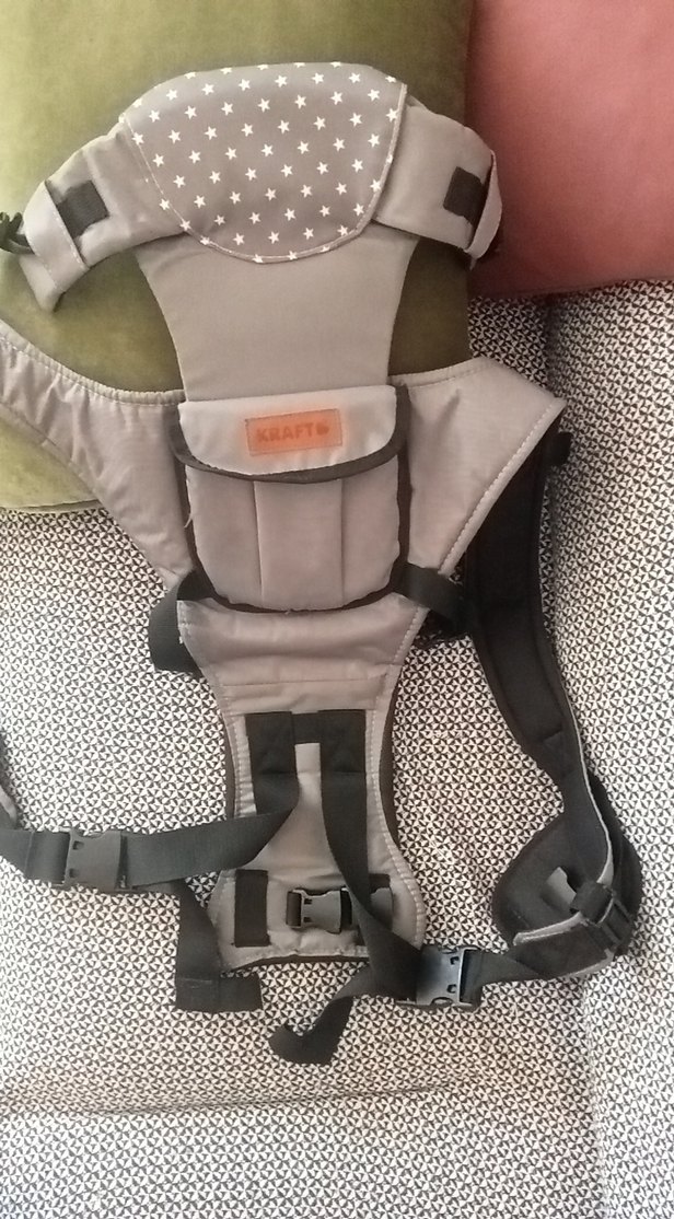 Ayarlanabilir kayışlara ve konforlu destek yastığına sahip gri bebek taşıyıcı kanguru. Bebekleri güvenle taşımak için uygundur. kraf marka bir kez kullanıldı