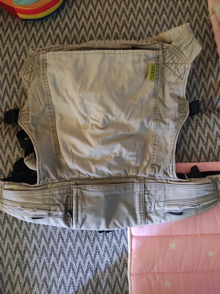 Ayarlanabilir kayışları ve yastıklı desteği olan gri bebek taşıyıcı. Rahat taşımaya uygun ve güvenli kullanım sağlar. biraz yıpranmalari mevcut fotoğraflardan görebilirsiniz