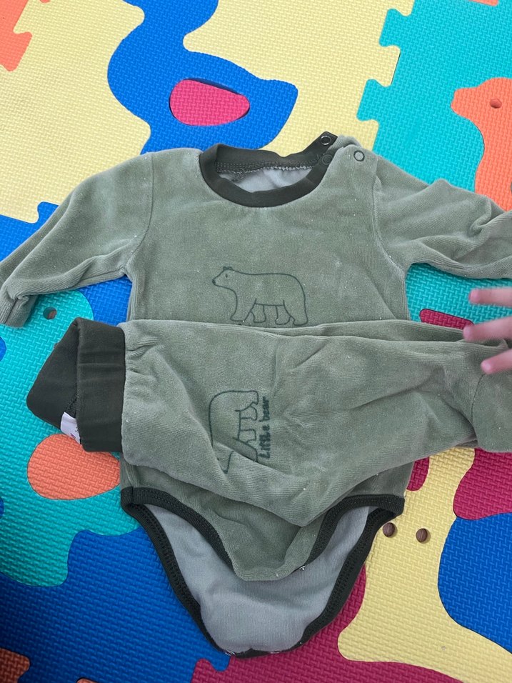 Gri renkli, uzun kollu, yuvarlak yakalı ve yumuşak polar kumaştan bebek kıyafet seti. Kolay giydirme için cırt cırtlı ve ayı desenli.