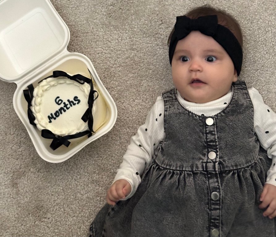 Gri renkli, uzun kollu, batik desenli bebek kız elbise takımıdır.