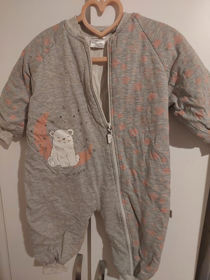 Gri renkli, fermuarlı bebek kız tulumu. Yuvarlak yakalı, önünde sevimli ayı desenli ve hafif desenli dokusu vardır. ❄️