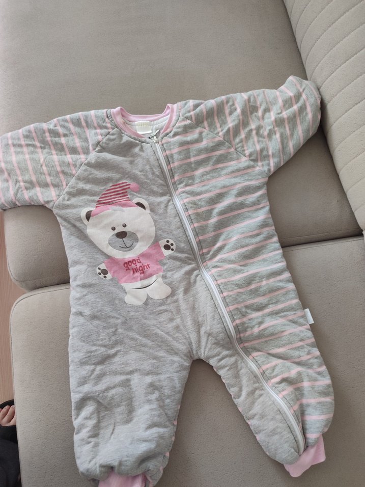 Gri renkli, fermuarlı ve bisiklet yaka bebek kız tulumu. Çizgili kollu ve baskılı ayıcık figürü bulunur. Yumuşak ve sıcak tutar. ❄️