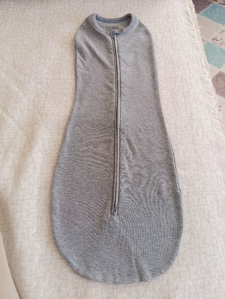 Fermuarlı, yumuşak ve rahat kumaştan yapılmış gri bebek kundak uyku tulumu, güvenli ve konforlu sarma sağlar. Çok az kullanıldı