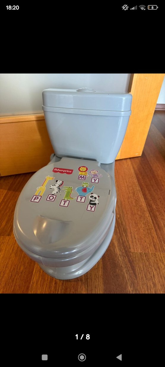 Yaklaşık 22 cm genişliğinde, yumuşak kenarlı gri renk bebek lazımlığı. Tuvalet eğitimini kolaylaştırır.sifon sesi çalışıyor yeni pil takılması gerek