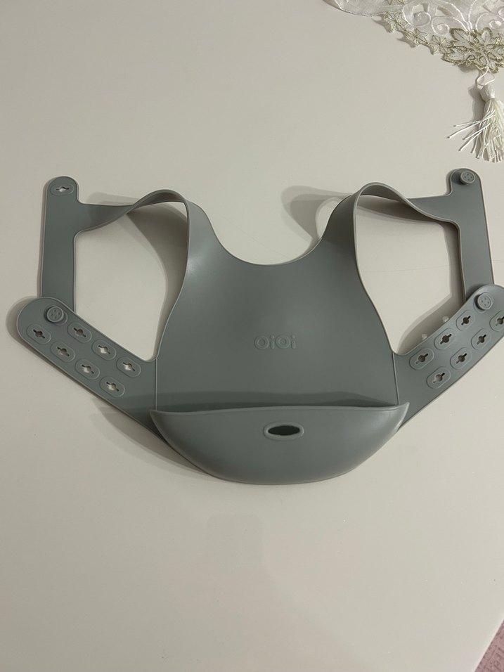 Ayarlanabilir kayışları ve yiyecek tutan cepli esnek malzemeden yapılmış gri bebek mama önlüğü. Temizlemesi kolay ve dayanıklı.