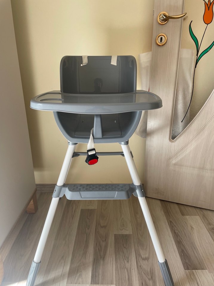 Gri mama sandalyesi, güvenli emniyet kemeri ve çıkarılabilir tepsi ile kolay temizlenir. Beyaz ayakları kaymaz tabanlıdır.