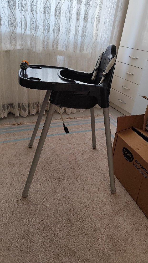 Gri renkli, tepsili ve güvenlik kemerli bebek mama sandalyesi.