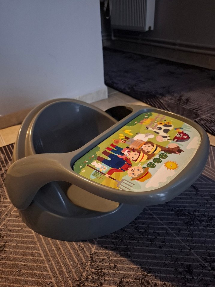 Gri renkli, çizgi film karakterli çiftlik temalı tepsiye sahip bebek mama sandalyesi, besleme ve oyun için uygundur. Banyo oturağı ayni zamanda